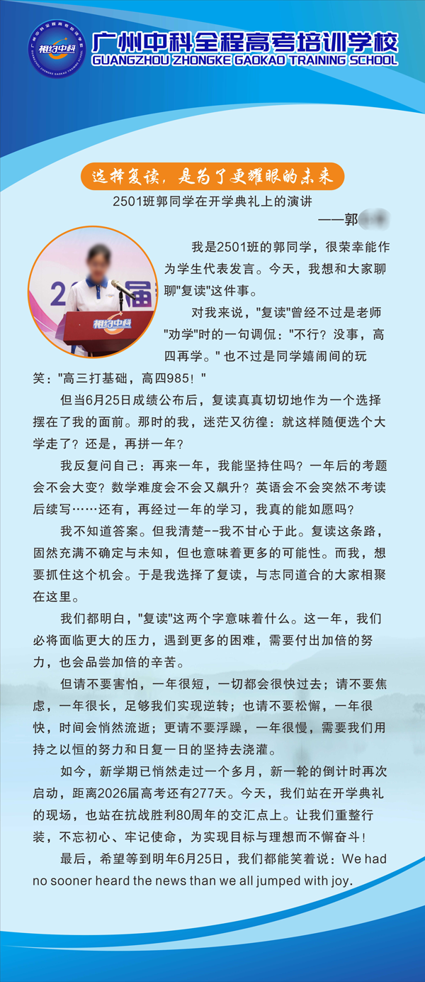 我是2501班的郭同学,很荣幸能作为学生代表发言。今天,我想和大家聊聊“复读”这件事。